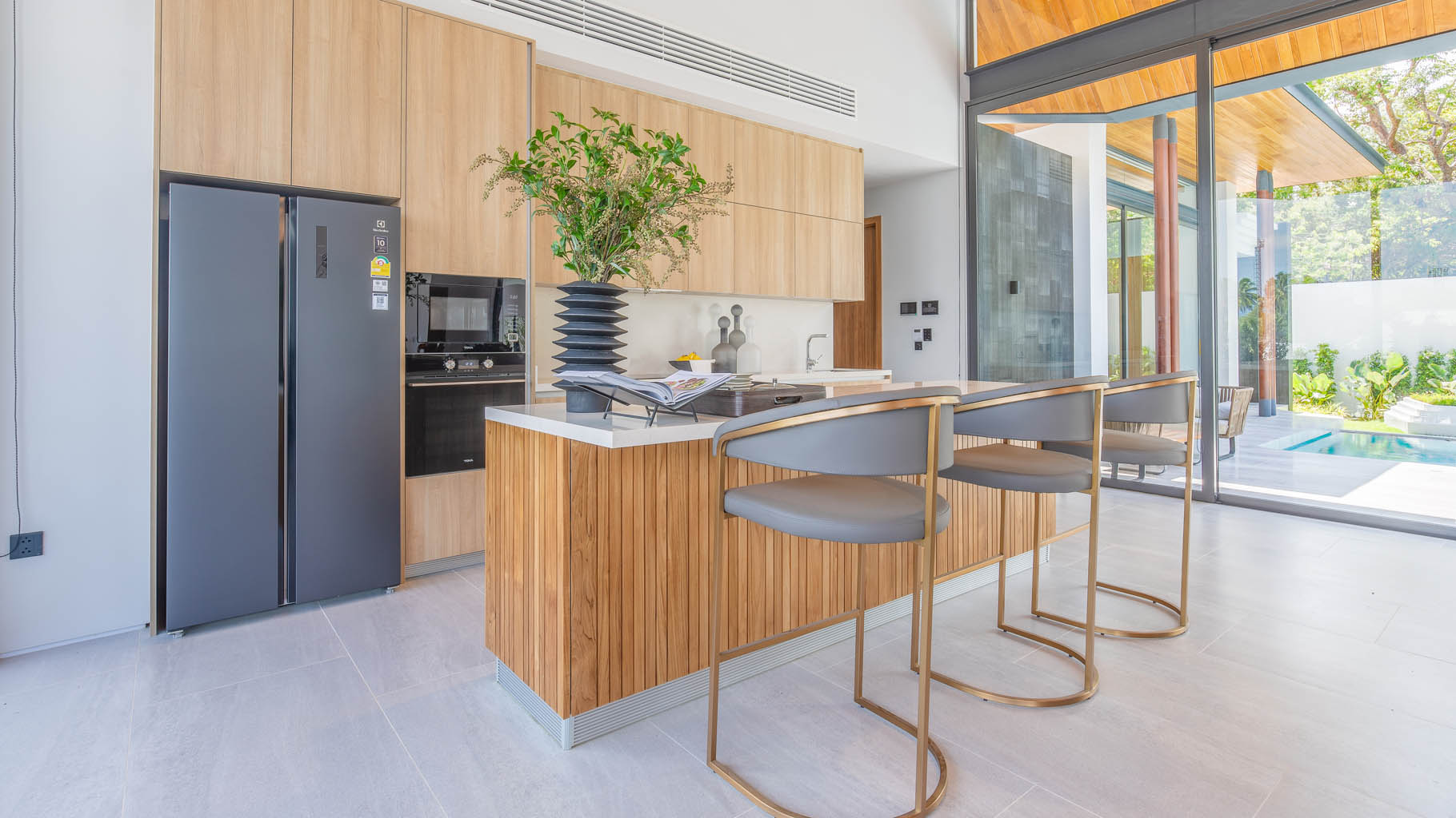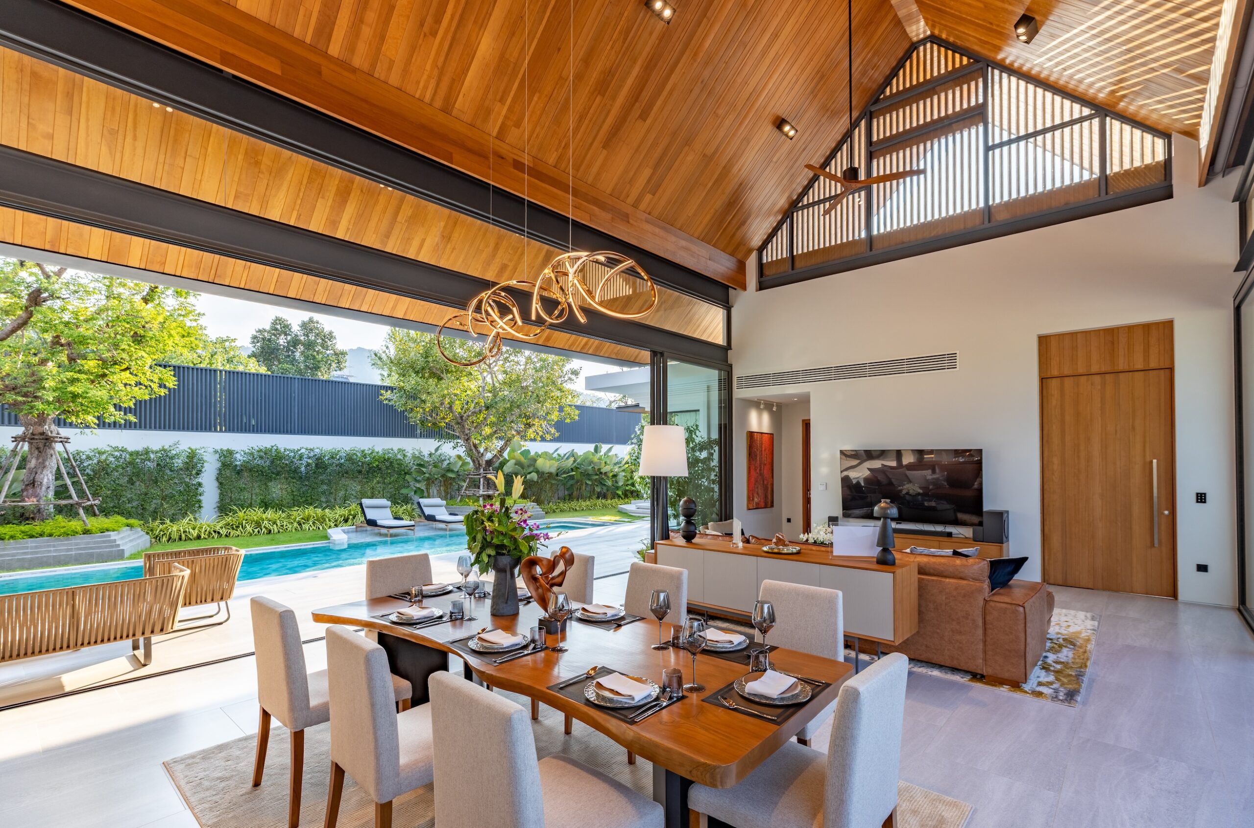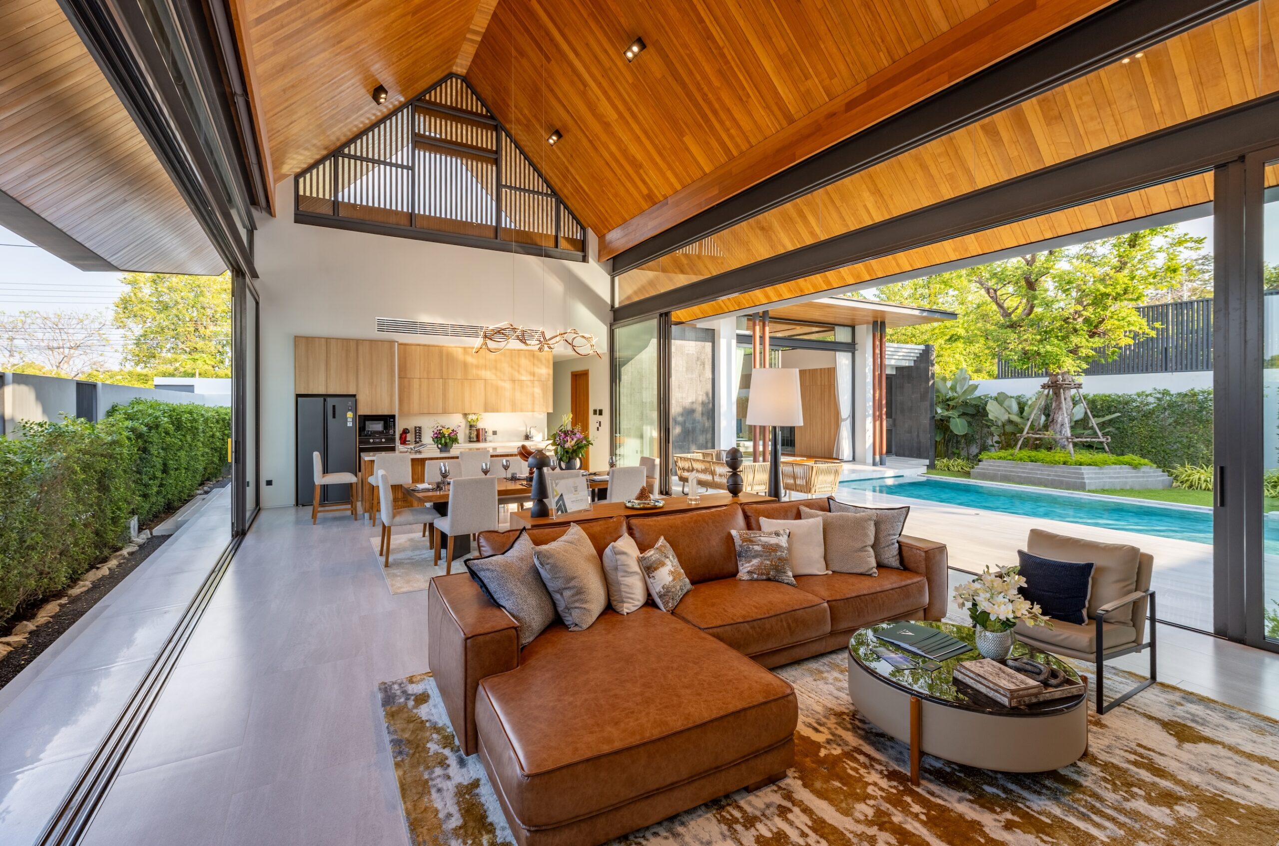 The unique villas seamlessly combine a traditional Thai gable roof’s charm with contemporary grace. Each meticulously crafted detail caters to an extraordinary lifestyle while maintaining individual privacy and fostering family connections. Inviting living space with 8-meter-high ceiling forms the spectacular backdrop for creating and cherishing unforgettable moments.